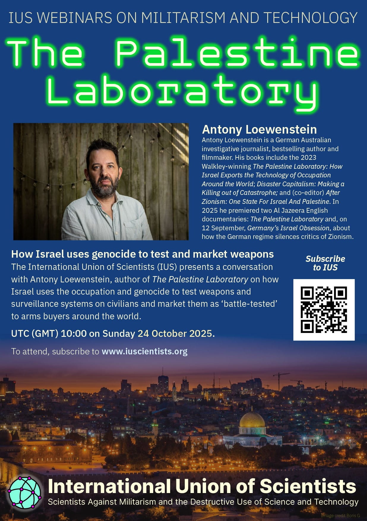 Join us live as award-winning journalist Antony Loewenstein unpacks the chilling political economy behind Israel’s military-industrial complex. A conversation between IUS scientists and the author.